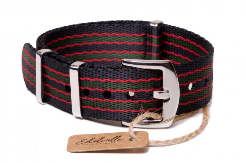 Edelwolle prémium Nato óraszíj, fekete/piros/zöld, 20mm