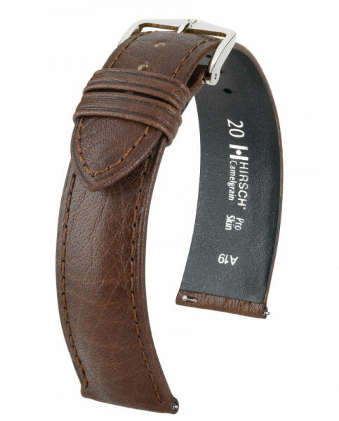 Az óraszíjak érzékeny bőrű szerelmesei szeretik a HIRSCH Essential termékcsalád klasszikus bőrkímélő termékét. A Hirsch Camelgrain robusztus borjúbőrből készül, amely a rostmélységig dobfestve van és HIRSCH Pro Skin védőbevonattal van ellátva. A Pro Skin eljárást a bécsi University Skin Clinic-kel együttműködésben fejlesztették ki, és bőrgyógyászatilag tesztelt rendszer. A Hirsch elegáns dombornyomott vonalai az óraszíjon, a finom tónusú varrás és a finom zsugorszemcsék a felületen harmonikusan teszik teljessé ennek az óraszíjnak a koncepcióját. A HIRSCH gyorskioldó rendszer biztosítja, hogy Ön könnyedén cserélje ki és szerelje össze az óraszíjat. Ehhez nincs szükség további eszközök beszerzésére. Használja letölthetőméretezési segédletünket
