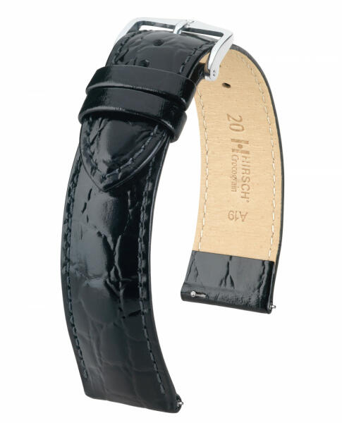 Lenyűgöző a diszkrét dizájnjával és különleges, elegáns fényével. Tartós borjúbőrből készült, karakteres krokodibőr mintázatú dombornyomással. Gyönyörű Hirsch Traditional Deisgn csattal és gyorszáras rugósfüllel ellátva. Használja letölthetőméretezési segédletünket